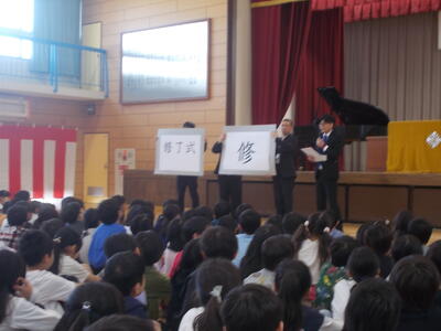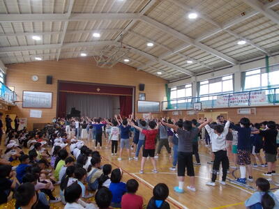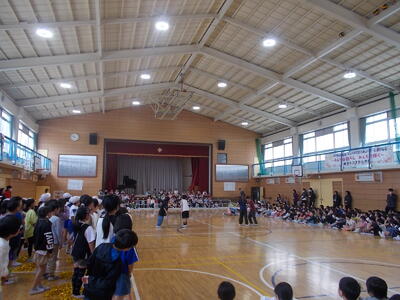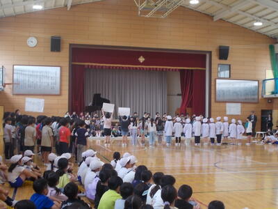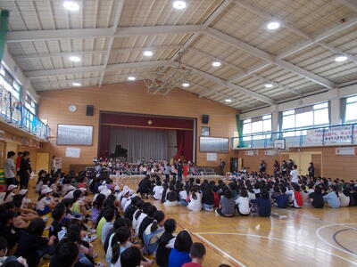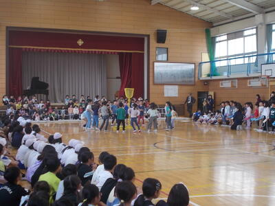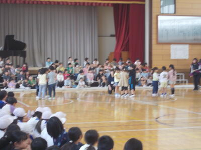各学年でひな壇のところに座っている1年生に出し物をみせながら、学校のことについていろいろと教えてあげていました。