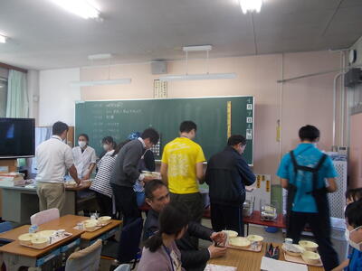 教職員による給食配膳研修の様子です。教職員が、給食中のルールや配膳の仕方の確認、除去食のアレルギー対応について確認しました。