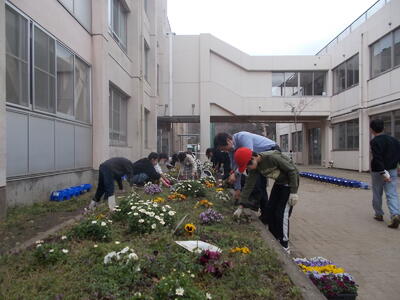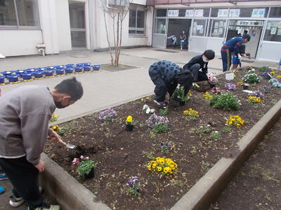 R7.3.6 環境委員会が昼休みに花植えを実施しました。
