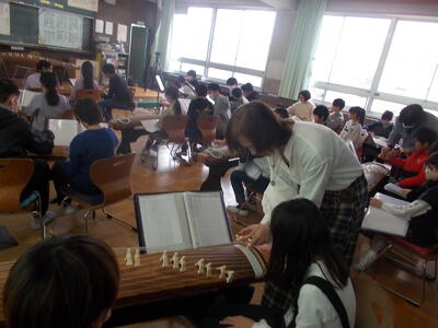 3月12日に琴外部講師の石川 佳子先生による琴の学習がありました。「さくら」などを実際に弾いて、楽しく学習できました。