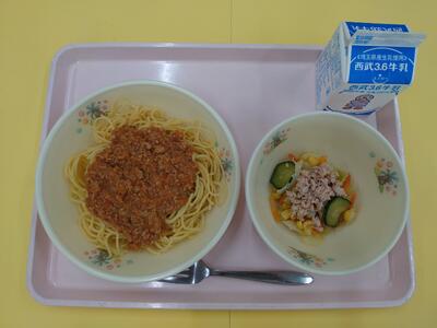 牛乳 スパゲティミートビーンズソース ツナと野菜のサラダ